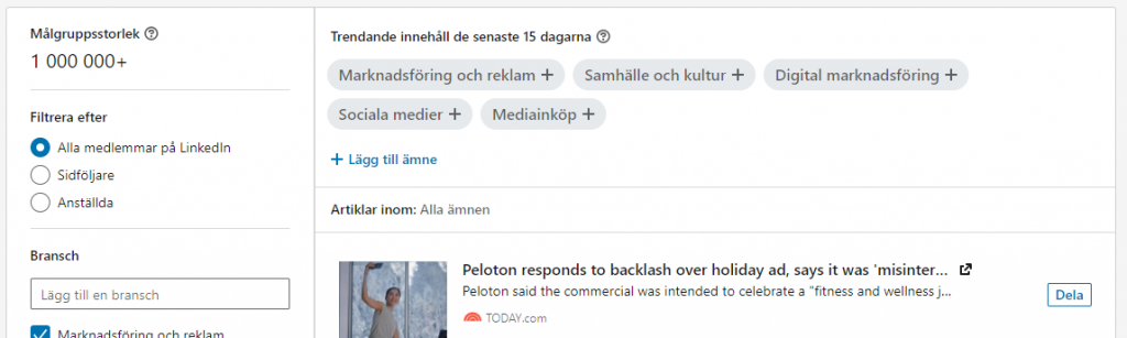Vi vet alla hur svår och jobbig idétorka kan vara att ta sig igenom. Genom verktyget “Innehållsförslag” hjälper LinkedIn sina kunder att hitta nya spännande nyheter att skriva om. Ni kan även skräddarsy dessa ämnen efter en viss målgrupp.
